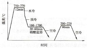 三、優(yōu)化淬火溫度提高工模具壽命 淬火溫度是鋼件淬火過程的重要工藝參數(shù),常用鋼的淬火溫度在熱處理手冊和有關(guān)技術(shù)書中都有數(shù)據(jù)可查,在生產(chǎn)中一般皆以此為選擇淬火溫度的依據(jù),這是無可非議的。但是,隨著近兒年來對馬氏體形貌和強韌化原理的深人研究,以及大量的工藝試驗和實踐,為我們?nèi)绾胃侠淼剡x擇淬火溫度,提供了新的依據(jù)和經(jīng)驗。由于在制定工藝或?qū)嶋H操作中,能正確選振和嚴格控制淬火溫度,往往可以使多種工模具的使用壽命顯著提高,取得明顯的經(jīng)濟效益。