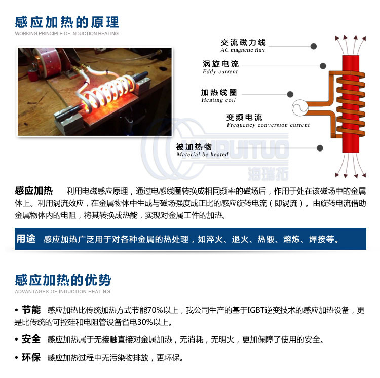 高頻大電流流向被繞制成環(huán)狀或其它形狀的加熱線圈(通常是用紫銅管制作),由此在線圈內(nèi)產(chǎn)生極性瞬間變化的強(qiáng)磁束,將金屬等被加熱物質(zhì)放置在線圈內(nèi),磁束就會(huì)貫通整個(gè)被加熱物質(zhì),在被加熱物質(zhì)內(nèi)部與加熱電流相反的方向產(chǎn)生很大的渦電流,由于被加熱物質(zhì)內(nèi)的電阻產(chǎn)生焦耳熱,使物質(zhì)自身的溫度迅速上升從而達(dá)到加熱的效果。