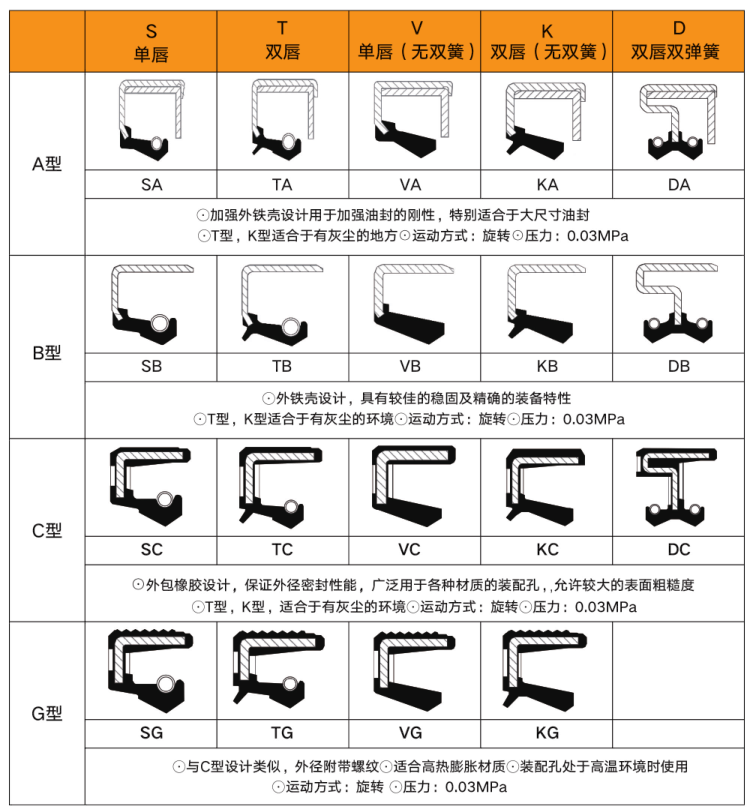 1、TC/SC型骨架油封:骨架油封中常用的類型,一般說的骨架油封就是指的TC油封